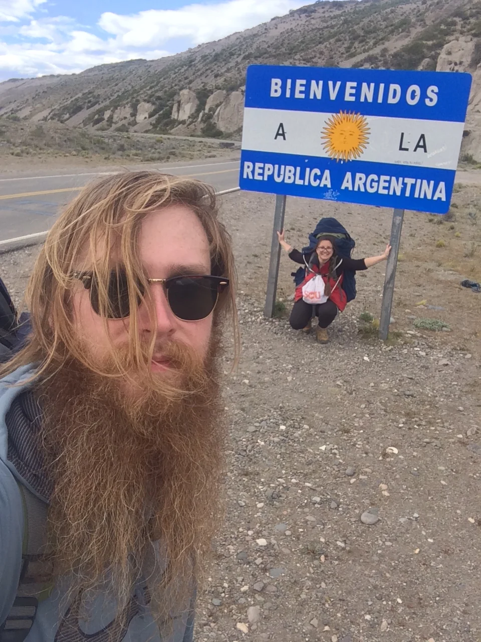 We managed to hitchhike, bus, and somehow drift our way to the main town through which most backpackers cross from the Chilean Patagonia into Argentina. Well, as we found out the next morning all buses to Argentina were cancelled indefinitely. So we said screw it and spent the day crossing the desert when in the distance appeared this magical sign…